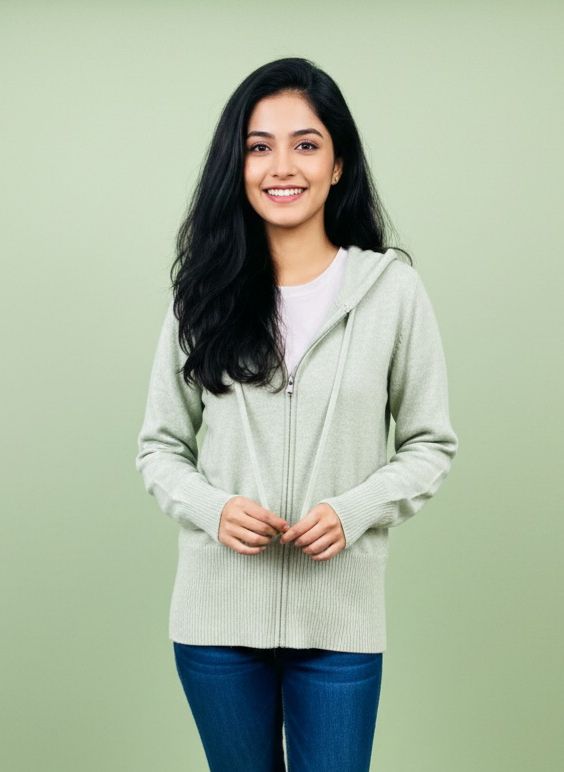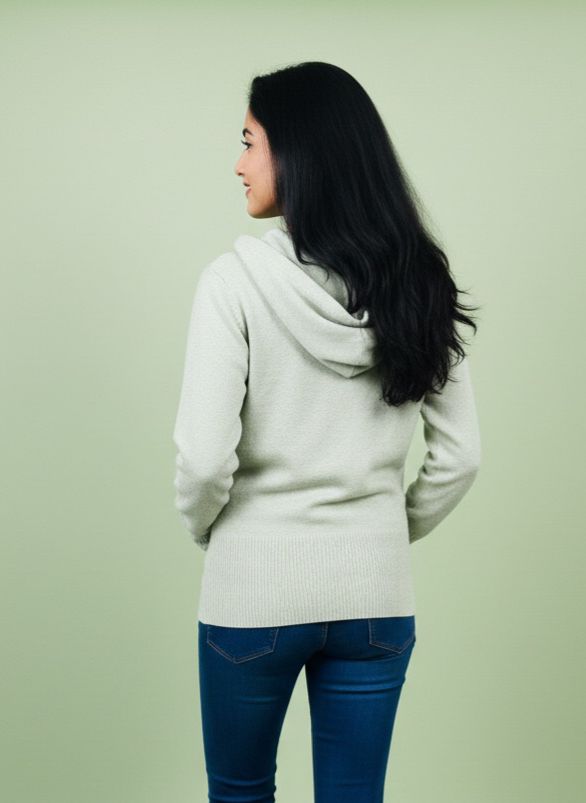* উপাদান: এগুলো নরম উলের সুতা দিয়ে বোনা (Knitted)। * ডিজাইন: * সামনে খোলার জন্য মেটালিক জিপার রয়েছে। * মাথা ঢাকার জন্য হুড এবং হুড টাইট করার জন্য অ্যাডজাস্টেবল ফিতা বা ড্রস্ট্রিং আছে। * কোমর এবং হাতের কব্জির কাছে চওড়া ইলাস্টিক বর্ডার (Ribbed hem and cuffs) দেওয়া হয়েছে, যা পোশাকটিকে শরীরে ফিট রাখতে সাহায্য করে। * ব্র্যান্ড: পোশাকের কলারের কাছে "Maariyah" ব্র্যান্ডের ট্যাগ দেখা যাচ্ছে。