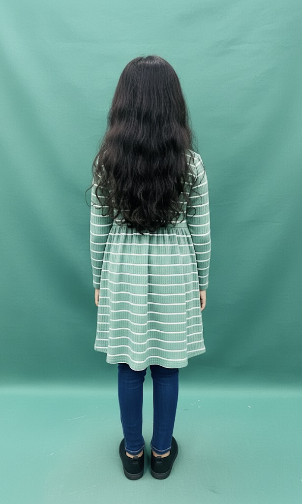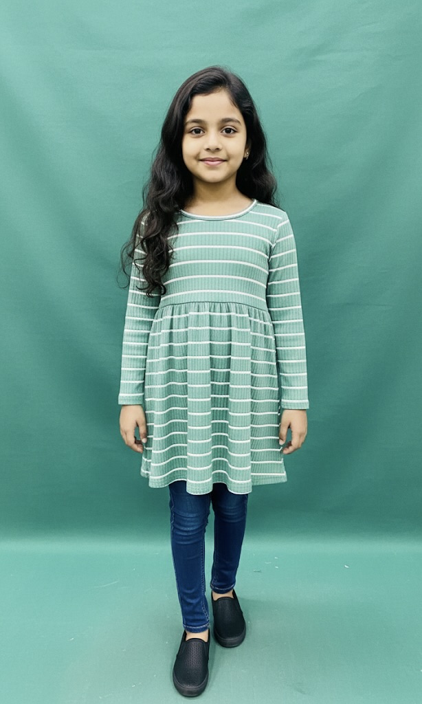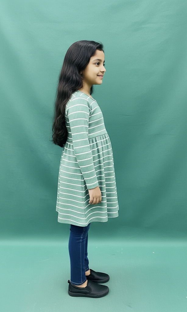 • কালার ও ডিজাইন: ড্রেসটি একটি স্নিগ্ধ মিন্ট গ্রিন (Mint Green) রঙের এবং এর সারা শরীরে সাদা রঙের আড়াআড়ি স্ট্রাইপ (Striped) ডিজাইন রয়েছে।