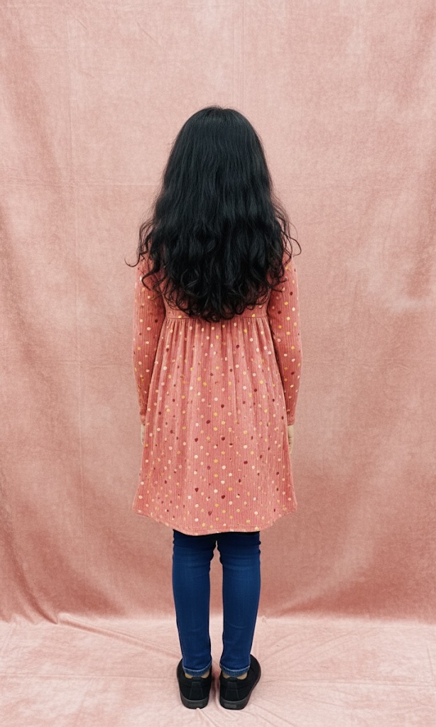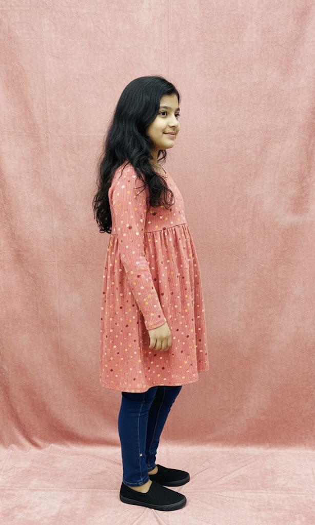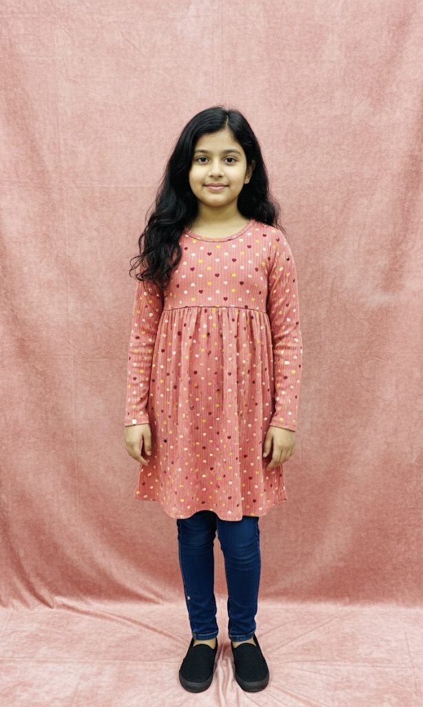 • কালার ও ডিজাইন: ড্রেসটি একটি সুন্দর পিচ বা ডাস্টি রোজ (Dusty Rose) রঙের। এর সারা শরীরে রঙিন ছোট ছোট হার্ট বা পোলকা ডট (Polka Dot) প্রিন্ট করা হয়েছে, যা শিশুদের খুব পছন্দ হবে।
