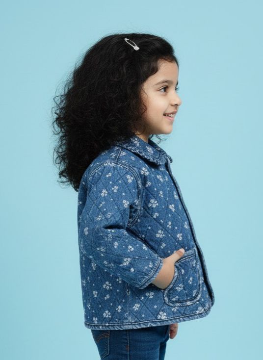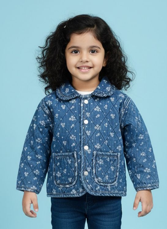 This attractive baby denim jacket is made of soft and comfortable quality fabric, so that babies can feel comfortable in the cold. The jacket has a cute flower print and diamond quilted design all over, which is a great combination of style and warmth.