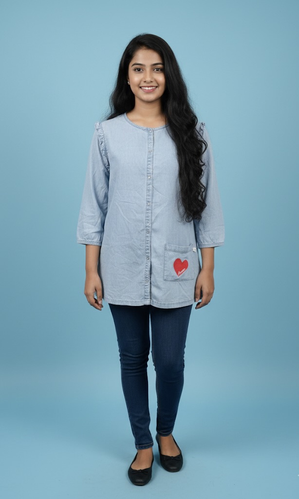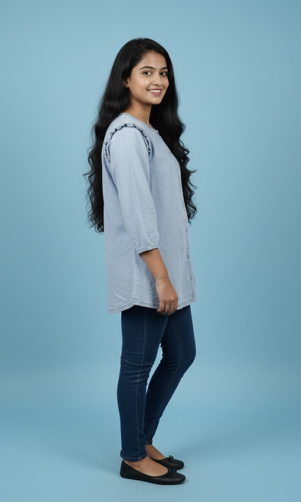 • কালার ও ফেব্রিক: টপটি একটি চমৎকার হালকা নীল বা লাইট ব্লু (Light Blue) ডেনিম শেডের। এটি উন্নত মানের সফট ডেনিম বা চেম্ব্রে ফেব্রিক দিয়ে তৈরি, যা দীর্ঘক্ষণ পরে থাকার জন্য বেশ স্বাচ্ছন্দ্যদায়ক।